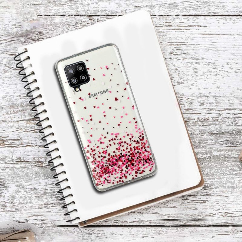 Et gjennomsiktig skall, som er tegnet med flere røde hjerter, som smelter sammen med de fine kurvene til Samsung Galaxy A12.