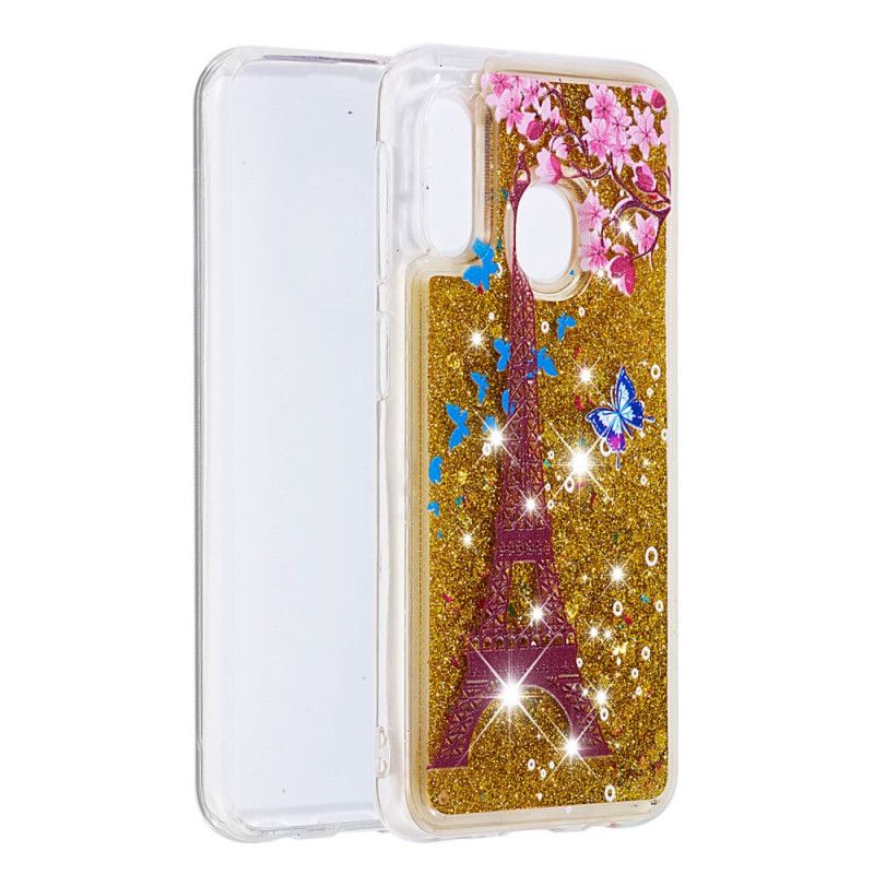 Oppdag dette skallet til Samsung Galaxy A20e, dekorert med Eiffeltårnet med mye gyldent glitter.