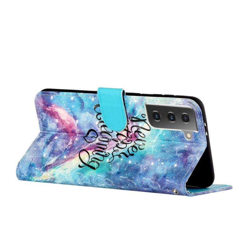 Samsung Galaxy S21 5G er veldig godt sikret med dette Light Spot Never Stop Dreaming faux lær dekselet som følger med en nøkkelbånd.